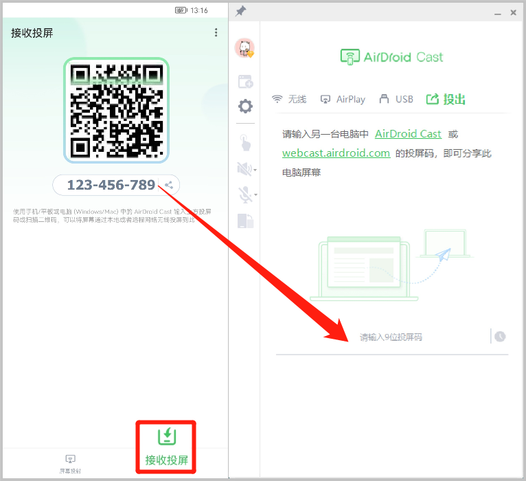 3、将 AirDroid Cast 安卓端中显示的投屏码输入到 AirDroid Cast 桌面端。